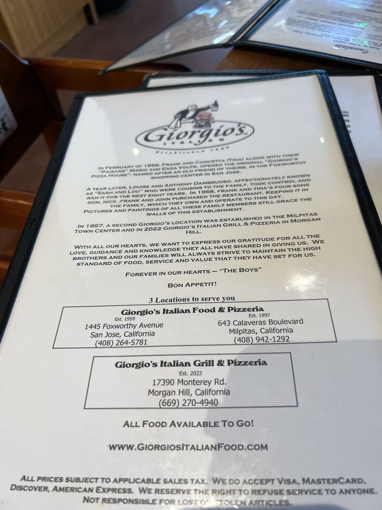 Welcome to Giorgio’s Italian Grill and Pizzeria, where rustic Italian flavors meet a warm, inviting atmosphere. Located in Morgan Hill, CA, this gem offers a delightful menu that proudly showcases traditional dishes crafted from the finest ingredients.